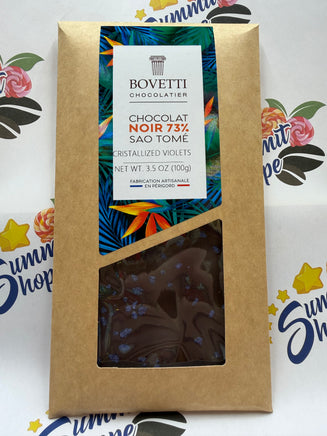 Indulge in the poetic marriage of dark intensity and delicate florals with this refined Bovetti chocolate bar. The robust 73% cocoa dark chocolate provides an earthy, slightly bitter foundation that creates striking contrast with crystallized violets—lending subtle floral perfume and an elegant visual accent. This 3.5oz bar represents the pinnacle of thoughtful chocolate design, where premium cocoa meets carefully selected botanicals to create a sophisticated sensory journey. A distinguished choice for those seeking chocolate experiences that transcend the ordinary.